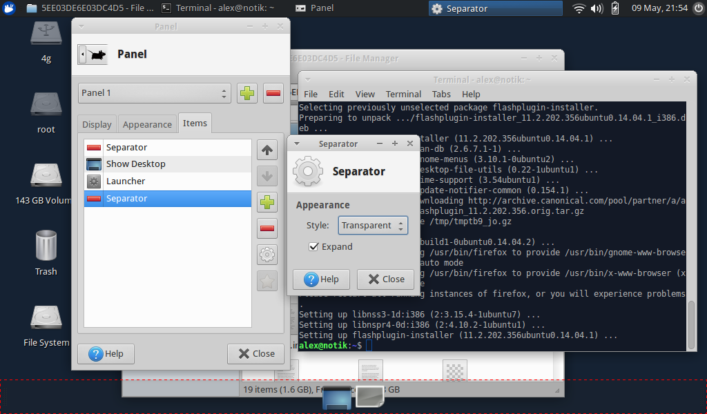 First of all panels have to be fixed. As far as I do not install xfce4-whiskermenu-plugin the upper panel is almost empty just after the installation. Add the 'Applications Menu' applet into the upper menu. The quick launch panel is completely missing in 14.04 so create a new panel and add two separators as the first and last items of the panel. Make these separators transparent and select expand on them. Other items should be added between these separators like it is shown on the picture below: